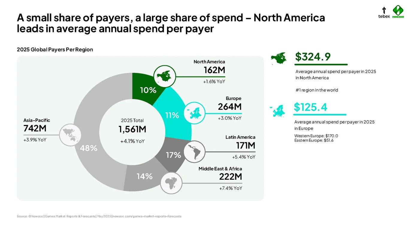 북미 게이머 한 명당 연평균 지출액은 $325로 세계 최상위