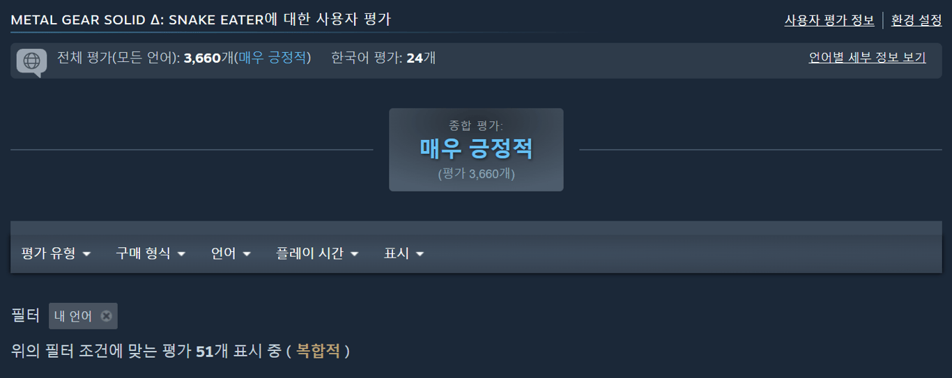 • 스팀 : 매우긍정적(81%), 한국 : 복합적(54%)
