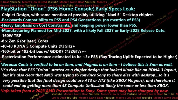 Sony PS6 Orion APU specs leak. (Image source: Moore's Law Is Dead on YouTube)