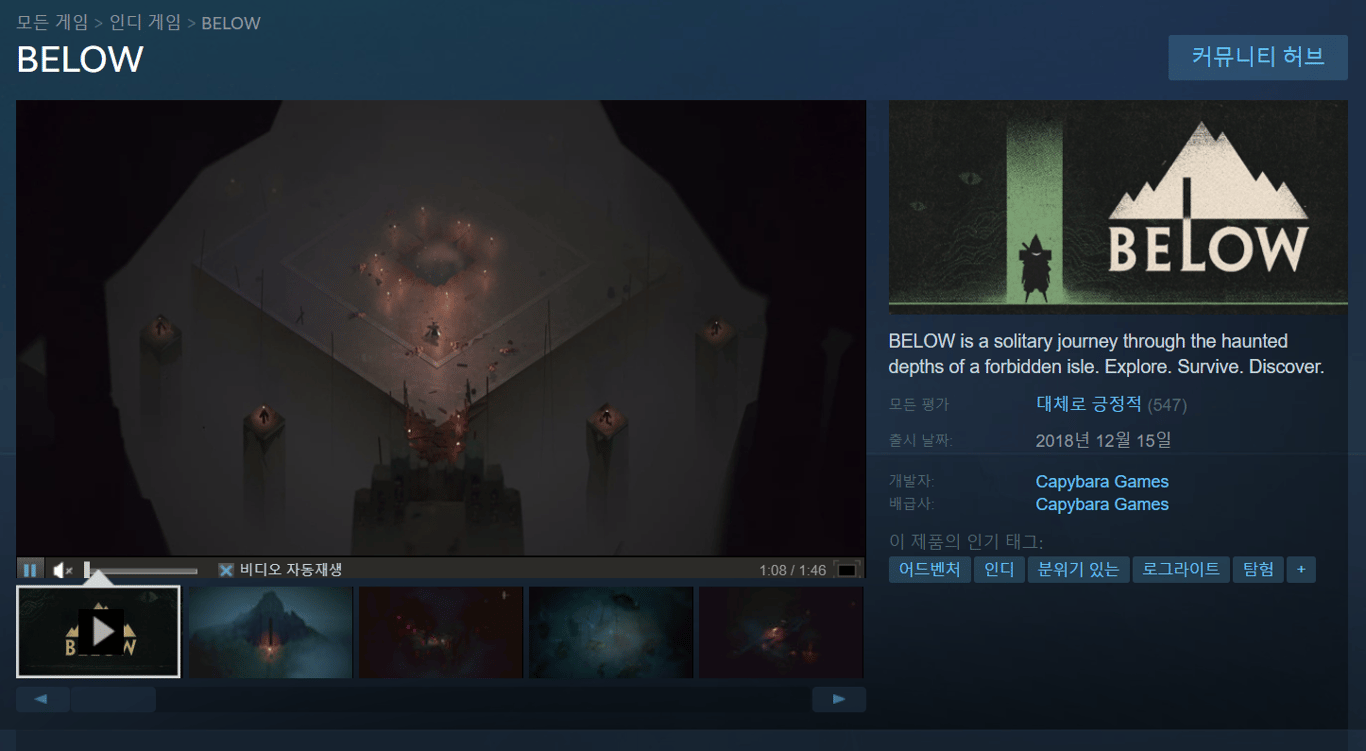 스팀 버전의 링크는 https://store.steampowered.com/app/250680/BELOW/?l=koreana 입니다.